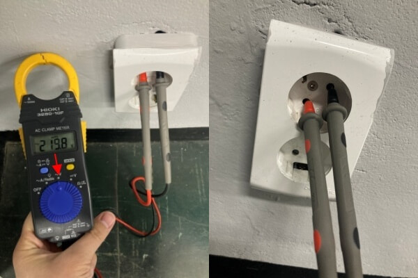 2. 콘센트의 전류를 측정하기 위해 콘센트의 구멍에 테스트 리드선을 넣어 측정합니다.