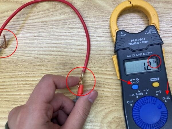 2. 전선의 첫 단과 끝단을 테스트 리드선을 붙이면 저항 값과 함께 '삐' 하는 소리가 들리면 선이 이상 없이 연결되어 있는 도통을 확인할 수 있습니다.